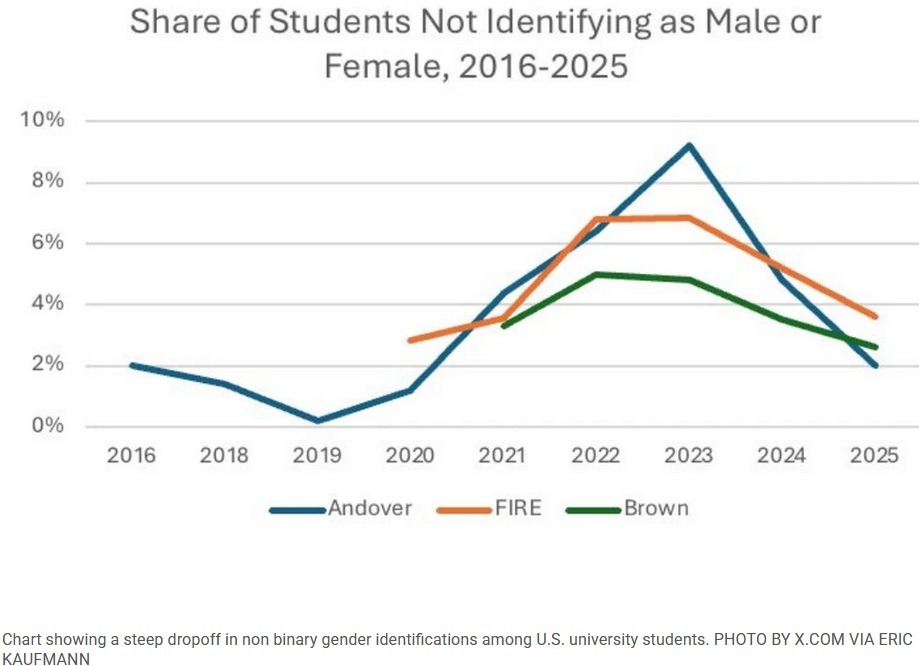 Ausgehend von einem Peak des Trans-Kults im Zeitraum der Jahre 2022 bis 2023 melden die Umfragen eine rapide Abkehr von queeren Identitäten in den zwei darauffolgenden Jahren. Von den 50.000 befragten Studenten der FIRE-Studie identifizierten sich 2022/2023 noch 6,8 Prozent als nichtbinär. 2025 waren es noch 3,6 Prozent. Vor allem Erstsemester und jüngere Studenten würden sich immer seltener als trans, queer, nicht-binär oder bisexuell bezeichnen.